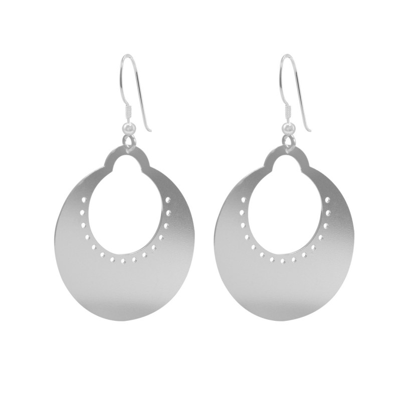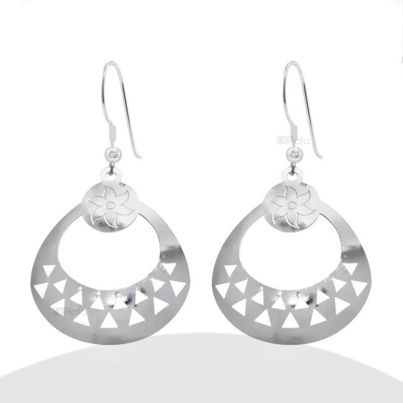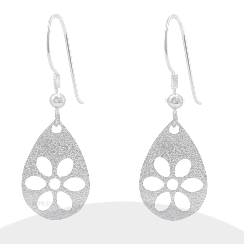 Aros gota satinado con diseño flor en el centro cierre gancho Plata 925