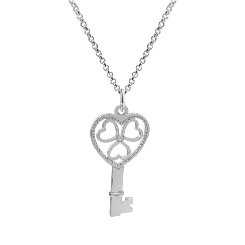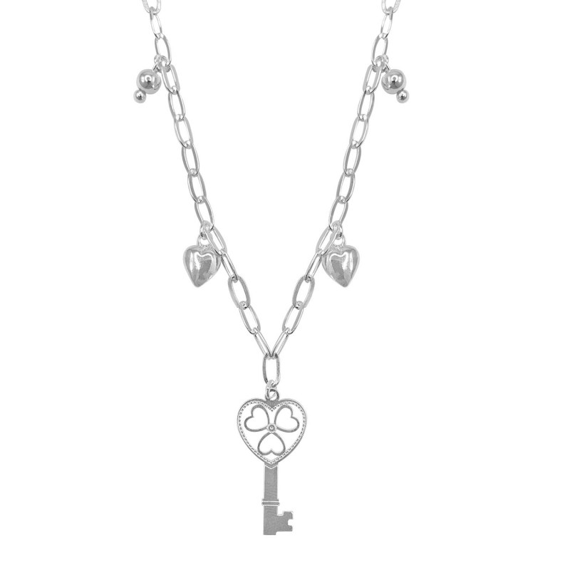 Collar llave corazón y flor de corazones 45cms mas 5cms extensión plata 925