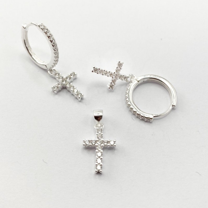 Set aro argolla diam: 15 mm y cruz con micro circones plata 925